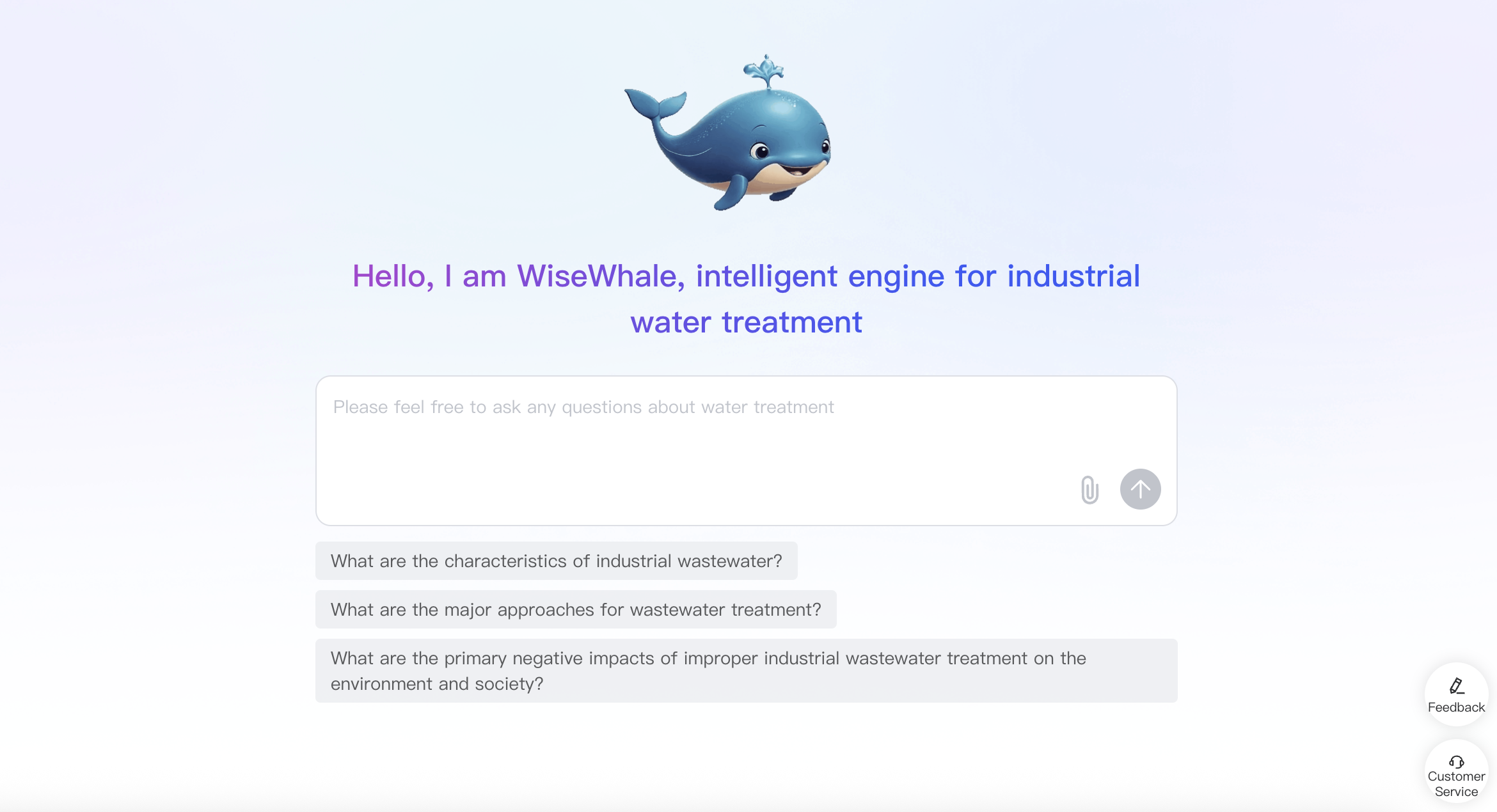 WiseWhale Water Treatment System is China’s first industrial-grade water treatment model, powered by a trillion-node water knowledge graph and massive multi-scenario industrial datasets. This system delivers an intelligent Q&A and decision-making platform spanning the complete water treatment lifecycle, offering practitioners precise, real-time, and traceable guidance.