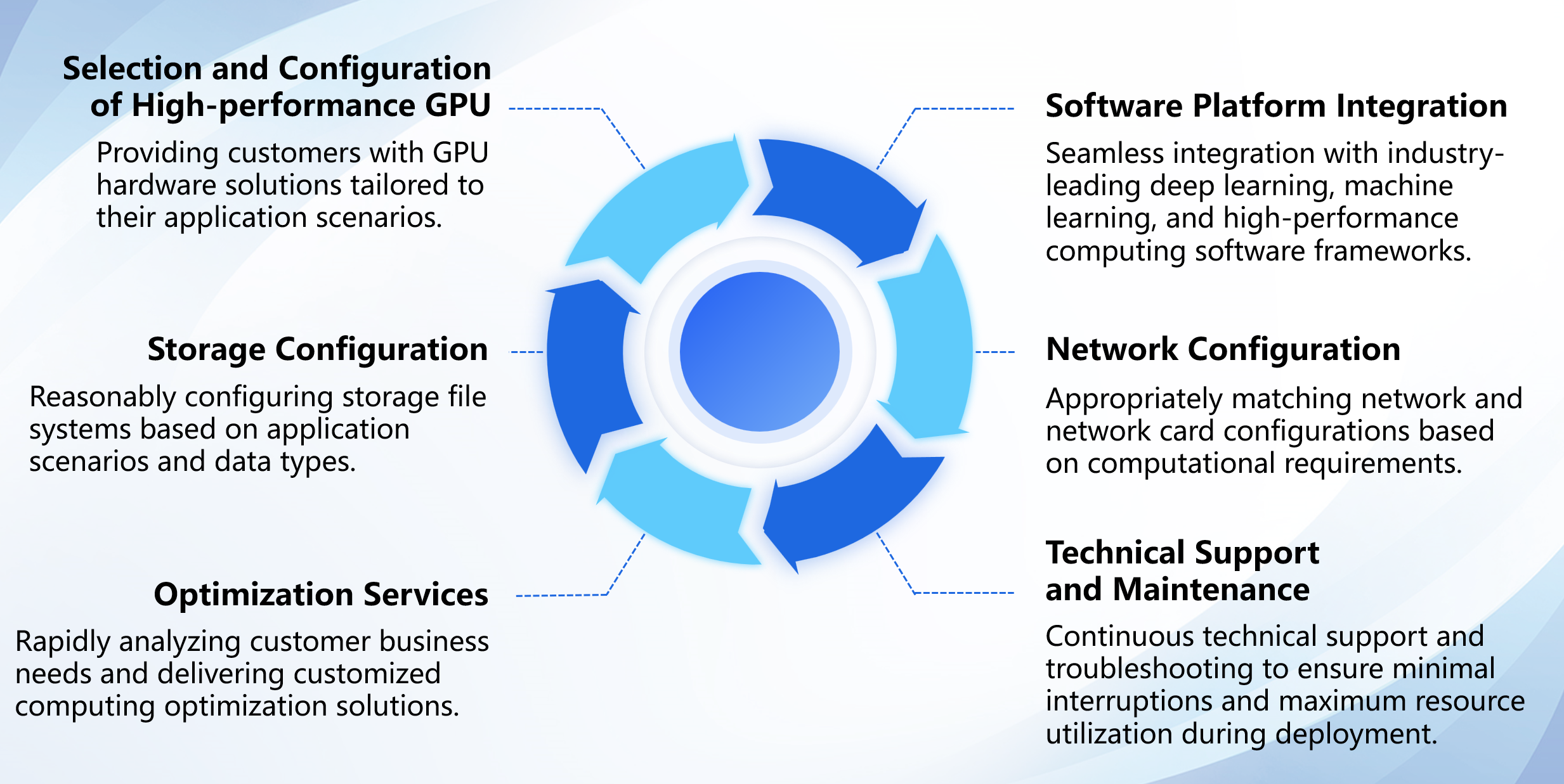 AI Cloud Platform Customization deploys pre-installed mainstream AI development tools and deep learning frameworks, integrated with accelerated file transfer technology and computing cluster tuning engine for intelligent computational acceleration and network communication optimization.